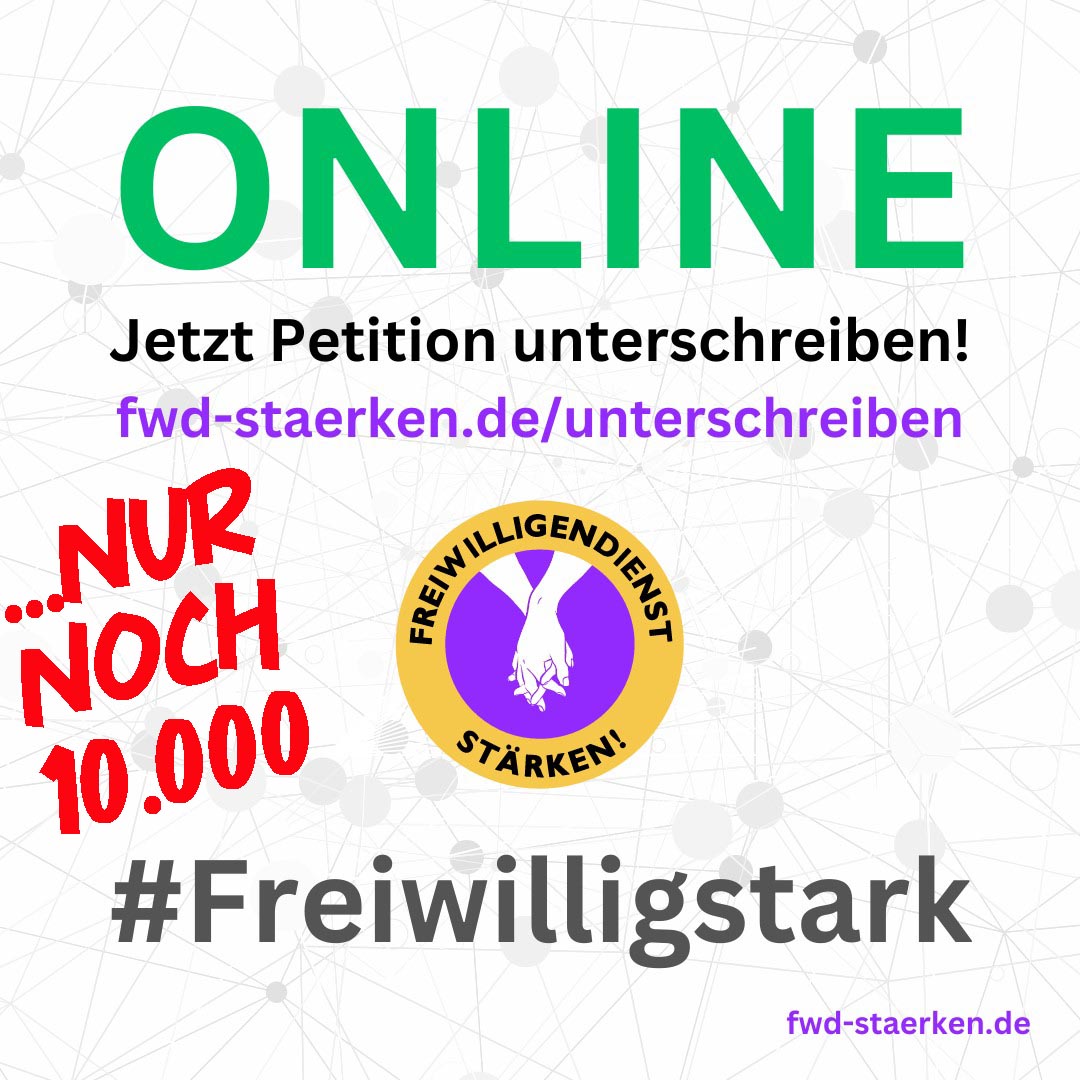 Über 40.000 Menschen unterstützen die Petition der Kampagne „Freiwilligendienst stärken“, die sich an den Deutschen Bundestag richtet. Die Petition fordert bessere Rahmenbedingungen für Freiwillige und deutlich mehr finanzielle Förderung der Freiwilligendienste im In- und Ausland durch den Bund und die Bundesländer.