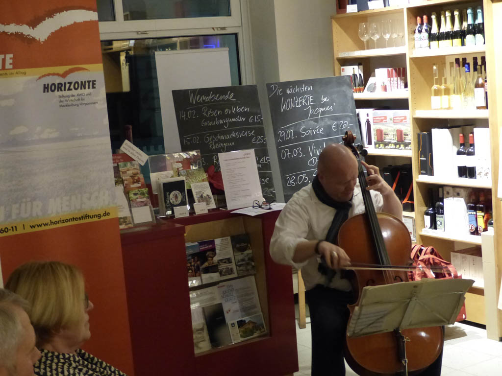 Die Stiftung Horizonte unterstützt damit weiterhin das Projekt „Schulmaterialienkammer“ im Schweriner Haus der Begegnungen.Eine Weinverkostung im musikalischen Rahmen. Die Veranstaltung am 06.02.2020 im Jacques‘ Wein-Depot in Schwerin erbrachte einen Reinerlös in Höhe von 960,00 Euro. Die Summe setzte sich aus den Eintrittsgeldern der Weinverkostung und dem Erlös aus der Versteigerung eines Premiumweines zusammen. Gesponsert wurden die Weine durch unsere Vorstandsmitglieder und dem Depotinhaber Ulrich Maiß, der darüber hinaus mit seinem Cello für einen anregenden musikalischen Rahmen sorgte.